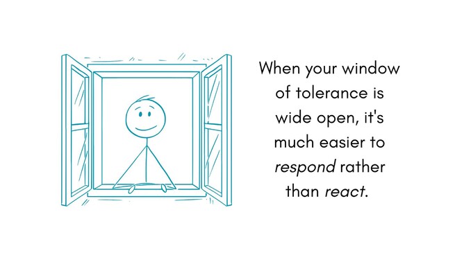 So, what can you do to keep your window of tolerance wide open, the blinds up, and yourself ultimately in a position to choose your response, rather than react to what happens?