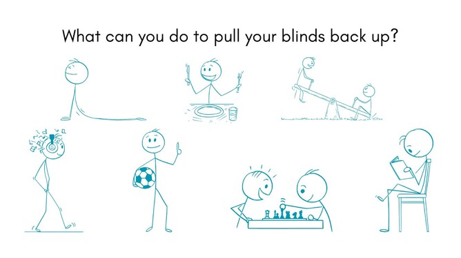 Notice how you are feeling and what you are feeling. See if you can check in with yourself around some of your basic needs, e.g. have you had enough water, food, sleep, movement, connection with others, etc. This is a useful check-in to do regularly as a lack of those things brings your blinds down. So a bit of self-awareness and awareness of how you are feeling is the first step.