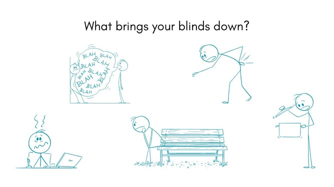 There are a few other things that can bring your blinds down too: a lack of sleep or feeling generally tired or exhausted, feeling angry, being hungry, … even worse if you are hangry…, experiencing pain, too much caffeine, drugs & alcohol, but also past experiences or ongoing frustrations with someone or something.