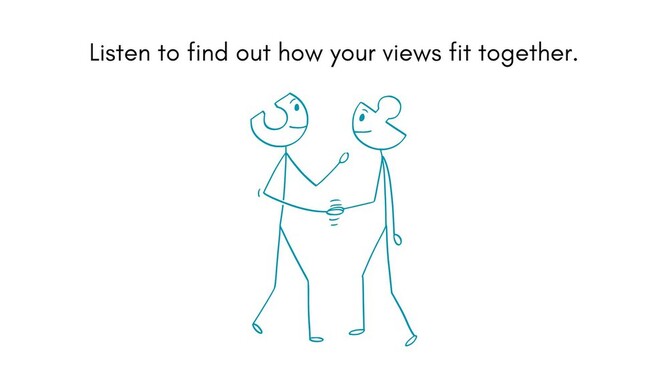 That's right. Find out as much about their view as you can. What is their view? What does that mean in detail and practice? How have they come to hold this view? Why does this perspective make sense to them? And why is it important to them?