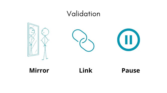 As soon as you offer a solution, you undo the validation you have just put in place. So pause. It allows the person to connect with themselves to figure out what they need. Remember, the emotion is like a notification for a need that sits underneath it. And remember, you can validate your own emotions. We often forget that we can. But it works just as well.
