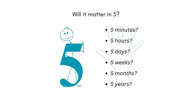An example of a strategy that helps you reappraise a situation is ‘Will it matter in 5?’ This is a strategy that encourages you to shift your time perspective. In situations where you find yourself getting worked up, upset, angry, or frustrated, ask yourself: