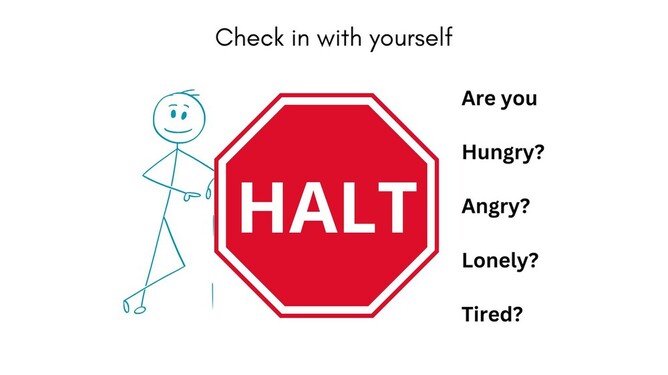 Building awareness using HALT and regulation strategies like validation and 'Will it matter in 5?' takes practice. They are really effective though. And no one has to know that you are practising. :)