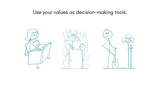 To make values-based decisions, you will need to know your values. This takes a little time and reflection, but it is worthwhile because your values are your guiding lights in just about everything you are doing.