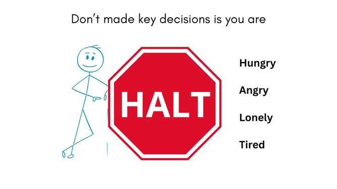 Instead, wait for the emotion to pass (and eat something). Take some time to regulate your emotions and make important decisions after that. Note that this does not mean every decision has to be entirely rational. Our gut feeling is often a useful indication of what we want or don’t want. And we want to make decisions that make us ‘feel’ good, so we might as well consider our feelings.