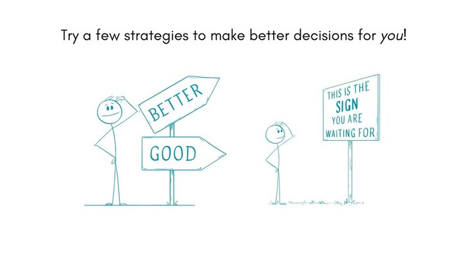 Another helpful strategy can be limiting your options or asking for help. Instead of looking at all possible options, pre-select two or three options or scenarios and pick between them. A simple example: A few years ago, I needed to buy a new sleeping bag for hiking. I wanted it to be a good one, but I also didn’t want to spend too much time researching and thinking about it. And, because I don’t need to replace my sleeping bag frequently, I also didn’t want to learn too much about the topic. So, instead, I asked a friend, who had recently done a lot of research on sleeping bags, what her top three choices were. When she sent them through, I looked at just those three and then chose the one that was the most suitable for my needs. This streamlined the whole process for me.