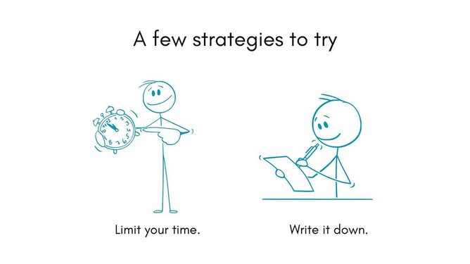 Both of these strategies also work with harder decisions. You can set a time limit. With harder decisions, you might give yourself a bit more time, e.g. you might decide now to decide later, say in two weeks. That gives you time to consider all the options and associated consequences. If a decision that needs to be made keeps hounding you, it can also help to schedule or set aside time to think about the decisions you need to make. You can use that time to write a list of possible options and break down what each scenario might look like, what you would need to consider in each case, and who and what else might be affected.