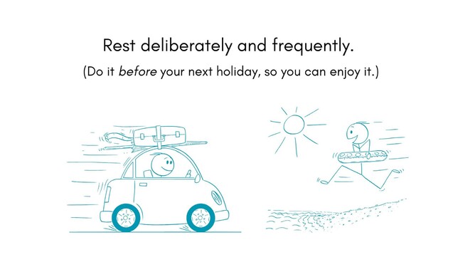 Have mini breaks. Create little periods to ensure you are rested and refreshed. Recovery doesn’t necessarily have to be long if you are prepared to make time for it and plan it deliberately. It can be a five-minute dance to your favourite song, it could be a phone call with a friend, or it could be a walk around the block. Little breaks more often might be much more useful to help you feel energised. And take breaks early and frequently. Recharge when you notice that you are struggling to concentrate, rest deliberately when you notice you get tired more quickly, when you find yourself switching off in conversations, or when you find you can’t quite listen well enough.